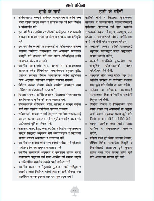 नेपाली कांग्रेसले स्थानीय तहको निर्वाचन प्रयोजनका लागि जारी गरेको घोषणा पत्रमा जनताको करबाट उठेको राजस्वलाई भ्यू टावर र स्वागतद्वार अनुत्पादक क्षेत्रमा लगानी गर्दैनौं भन्ने प्रतिज्ञा गरेको छ ।