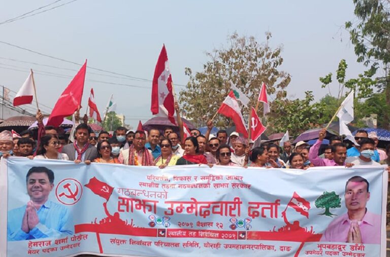 माओवादी केन्द्रका नेता शर्माले मेयरमा र उपमेयरमा कांग्रेसका भुपबहादुर डाँगीले उम्मेदवारी दर्ता गराएका हुन् । उनीहरु बाजागाजासहित निर्वाचन अधिकृतको कार्यालयमा पुगेर मनोनयन दर्ता गराउन पुगेका थिए ।