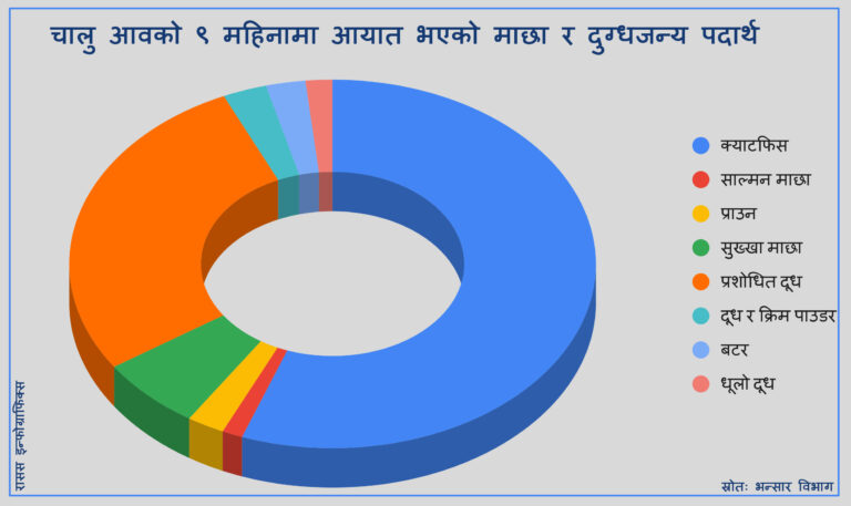 सुक्खा माछाको आयातको विवरण पनि त्यस्तै छ । विभागका अनुसार दुई लाख ९५ हजार ६१ किलो सुक्खा माछा आायत गर्दा सरकारले रु दुई करोड ९५ लाख दुई हजार बराबर राजश्व सङ्कलन गरेको छ । त्यस्तो माछाको आयात मूल्य नौ करोड ६६ लाख ८१ हजार बराबर छ ।