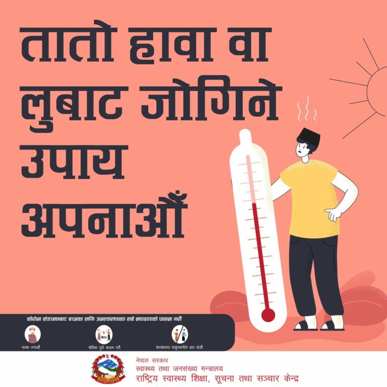 काठमाडौं, १३ वैशाख । स्वास्थ्य तथा जनसङ्ख्या मन्त्रालयले तातो हावा (लु)बाट जोगिन आग्रह गरेको छ । गर्मीयाम बढेसँगै तराईमा तातो हावा चल्न थालेकाले मन्त्रालयले सूचना जारी गर्दै लुबाट बच्न दिउँसो घरबाट ननिस्कन आग्रह गरेको छ ।