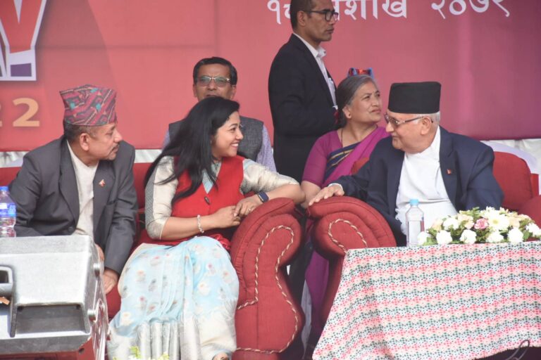 काठमाडौं, १८ बैशाख । नेकपा (एमाले) का अध्यक्ष केपी शर्मा ओली र एमालेबाट काठमाडौं महानगरको उपमेयरकी उम्मेद्धवार सुनिता डंगोल एक कार्यक्रममा भलाकुसारी गर्दै । एमालेबाट मेयरमा भने केशब स्थापित उठेका छन् ।
