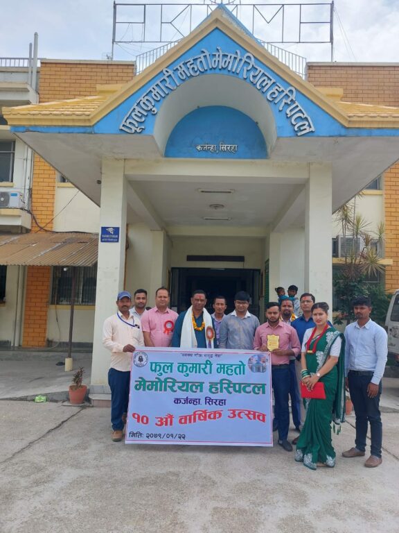 काठमाडौं, २४ बैशाख । सिरहाको कर्जन्हा नगरपालिकामा रहेको फूलकुमारी महतो मेमोरियल अस्पतालले आफ्नो स्थापनाको १०औं वर्ष मनाएको छ । वार्षिकोत्सवको अवसरमा अस्पताल प्रशासनले उत्कृष्ट भूमिका निर्वाह गर्ने कर्मचारी र पारामेडिक्सहरुलाई सम्मान गरेको थियो।