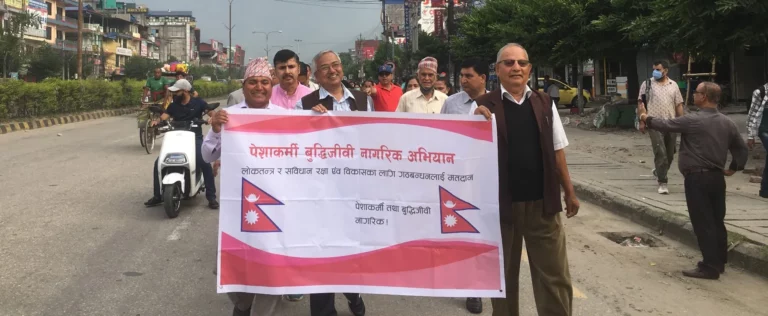 अग्रभागमा पेशाकर्मी बुद्धिजीवि नागरिक अभियान, लोकतन्त्र र संविधानको रक्षा एवं विकासको लागि गठबन्धनलाई मतदान भन्ने व्यानर सहित बजारमा प्रभात फेरी गरेका हुन् ।