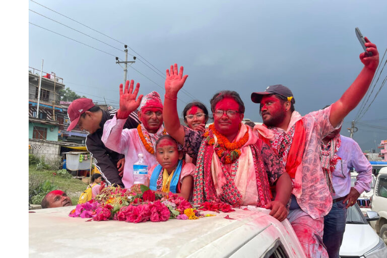 दमौली,२ जेठ । तनहुँको म्याग्दे गाउँपालिकाको अध्यक्ष पदमा निर्वाचित हुनुभएका नेकपा (एमाले) तनहुँका श्रीप्रसाद श्रेष्ठ सोमबार विजय ¥यालीमा सहभागी हुँदै । तस्बिर : कृष्ण न्यौपाने÷रासस