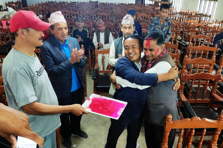ताप्लेजुङ, ४ जेठ । ताप्लेजुङको सिरीजङ्गा गाउँपालिकाको अध्यक्ष पदमा नेपाली कांग्रेसबाट विजयी भएका लालकृष्ण चौहानलाई बधाई तथा शुभकामना दिँदै सोही पदमा नेकपा (एमाले) बाट प्रतिस्पर्धी उम्मेदवार सन्तोष चाम्लिङ । अध्यक्ष पदका लागि चुनावी मैदानमा उत्रिएका चाम्लिङ ६८ मतले पछि परेका थिए । तस्बिरः सन्तोष पुर्कुटी÷रासस