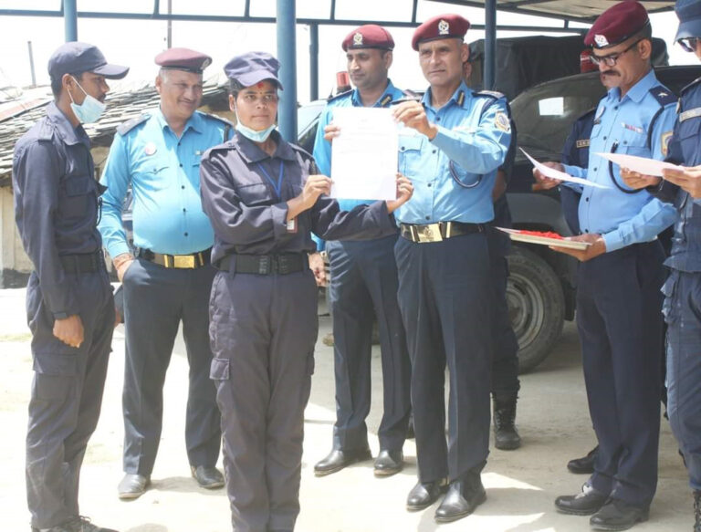 डडेल्धुरा,६ जेठ । डडेल्धुरामा सम्पन्न भएको स्थानीय तह निर्वाचन सुरक्षार्थ म्यादी प्रहरीको इमान्दार, बफादार भई अनुशासित ढङ्गले तोकिएको कार्यक्षेत्रमा खटी निर्वाचन कार्यलाई स्वतन्त्र, निस्पक्ष, भयरहित एवं शान्तिपूर्ण वातावरणमा सम्पन्न गर्नमा महत्वपूर्ण भूमिका निर्वाह गर्नुभएका म्यादी प्रहरीहरुलाई शुक्रबार जिल्ला प्रहरी कार्यालय डडेल्धुराका प्रमुख प्रहरी नायव उपरीक्षक देवेन्द्रबहादुर पालबाट धन्यवादसहित प्रमाणपत्र वितरण गरी बिदाइ गर्दै । तस्वीर ः करन ताम्राकार÷रासस