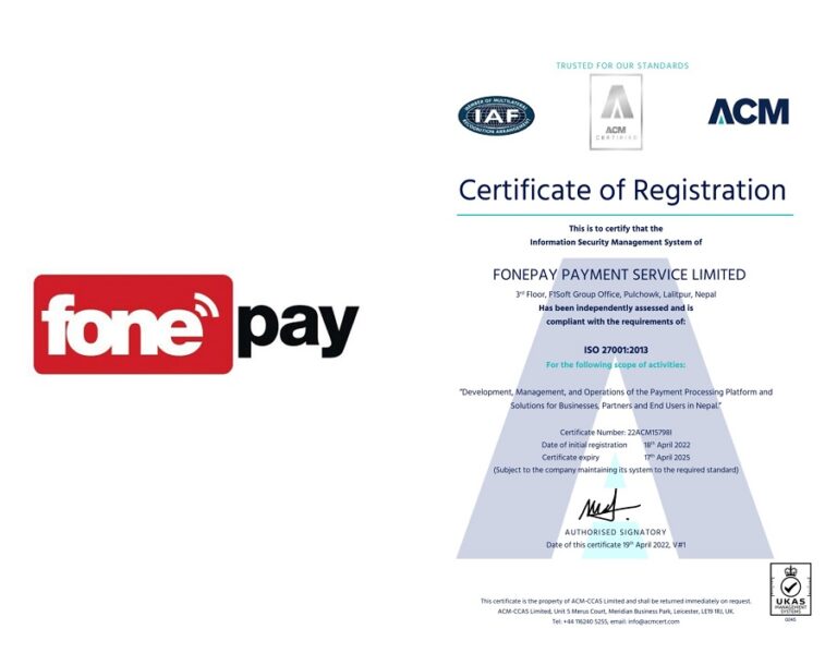 काठमाडौं, ११ जेठ । नेपालको आग्रणी भुक्तानी प्रणाली सञ्चालक फोनपे पेमेन्ट सर्विस लिमिटेड आइएसओ २७००१ः२०१३ बाट प्रमाणिकरण हुन सफल भएको छ ।