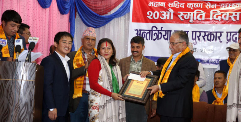 काठमाडौँ,१३ जेठ । नेपाल कम्युनिष्ट पार्टी (माओवादी केन्द्र)का अध्यक्ष पुष्पकमल दाहाल ‘प्रचण्ड’ प्रेस सेन्टर नेपालद्वारा आयोजित कार्यक्रममा वरिष्ठ पत्रकार शक्ति लम्साल र तारा न्यौपानेको स्मृतिमा स्थापित शक्ति–तारा स्मृति पत्रकारिता पुरस्कार सेन्टरका संस्थापक सदस्य तथा उपाध्यक्ष लक्ष्मी पुनलाई प्रदान गर्दै । तस्बिर ः अशोक घिमिरे÷रासस
