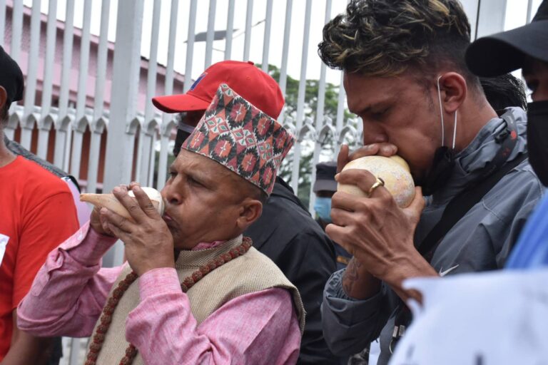 पार्टीका कार्यकर्ताले ‘जेष्ठ १५ धोका हो, धोका दिने को को हो ?, देशभक्त नेपाली एक हौ ।, देश बचाउन उठौं ।, धर्म संस्कृति परम्परा बचाऔ धर्म निरपेक्ष बादीहरुलाई भगाऔ ।’ जस्ता प्लेकार्ड बोकेका थिए । भने केहीले शङ्ख फुकेका थिए । Photo : Mukunda Kalikote/Reportersnepal.com
