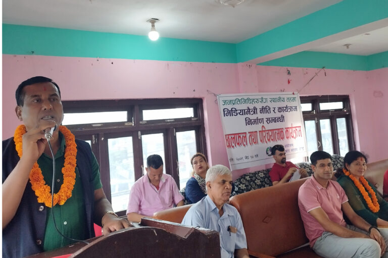 काठमाडौँ,१७ जेठ । नेपाल पत्रकार महासङ्घ दाङले आयोजना गरेको मिडियामैत्री नीति र कार्यक्रम निर्माणसम्बन्धी छलफलमा घोराही उपमहानगरपालिकाका प्रमुख नरुलाल चौधरी । तस्बिरः रञ्जिता अधिकारी÷रासस
