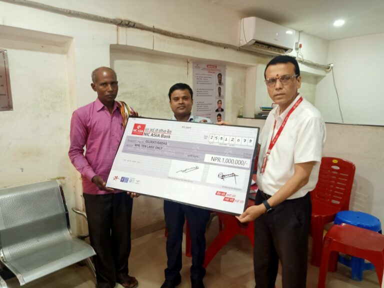 काठमाडौं, १९ जेठ । एन आई सी एशिया बैंकले न्यू प्रिमियम सुपर चमत्कारिक बचत खाता योजनाअन्तर्गत बैंकको कपिलवस्तु स्थित तौलिहवा शाखामा न्यू प्रिमियम सुपर चमत्कारिक बचत खाता ‘डायमण्ड श्रेणी’ को खाता खोलेका गुजराती राइदासलाई घातक रोगको बीमा वापत १० लाख बीमा रकम भुक्तानी गरेको छ ।