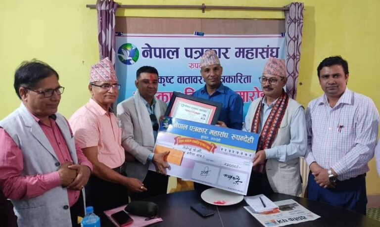 वातावरण दिवसको अवसरमा पत्रकार महासंघ रुपन्देहीमा स्थापना गरिएको वातावरणीय पत्रकारिता पुरस्कारबाट पत्रकार तेजेन्द्र केसीलाई सम्मान गरिएको छ । रिपोर्टर्स क्लब नेपाल लुम्बिनी प्रदेशका उपाध्यक्ष समेत रहेका पत्रकार केसीलाई नगद २५ हजारसहित सम्मान गरिएको हो । पत्रकार महासंघका अध्यक्ष रामराज पोखरेलको अध्यक्षता र सचिव विनोद परियारको सञ्चालनमा कार्यक्रम भएको थियो ।