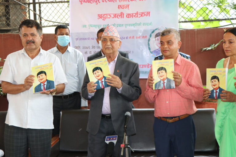 काठमाडौँ,२४ जेठ । नेकपा (एमाले)का अध्यक्ष केपी शर्मा ओली निवास बालकोटमा पुष्पबहादुर वरुवालको प्रथम स्मृति दिवसका अवसरमा आयोजित कार्यक्रममा वरुवाल स्मारिका, २०७९ को लोकार्पण गर्दै अध्यक्ष ओलीलगायत नेताहरु । तस्बिर : चन्द्रकला क्षेत्री÷रासस