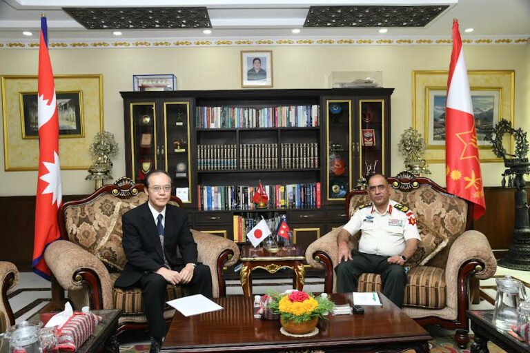 काठमाडौं, २५ जेठ : नेपालका लागि जापानका राजदूत किकुता युताकाले प्रधानसेनापति प्रभुराम शर्मासँग शिष्टाचार भेट गरेका छन् । राजदूत युताकाले आज सैनिक मुख्यालय जंगी अड्डा पुगी प्रधानसेनापतिसँग भेटवार्ता गरेका हुन् ।