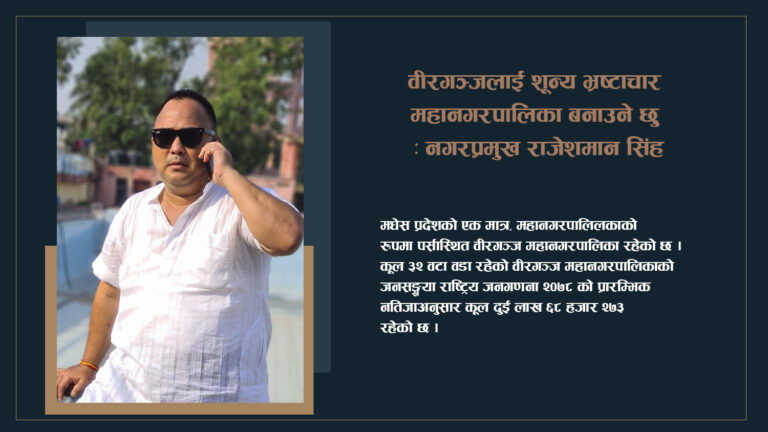 मधेस प्रदेशको एक मात्र, महानगरपालिलकाको रुपमा पर्सास्थित वीरगञ्ज महानगरपालिका रहेको छ । कूल ३२ वटा वडा रहेको वीरगञ्ज महानगरपालिकाको जनसङ्ख्या राष्ट्रिय जनगणना २०७८ को प्रारम्भिक नतिजाअनुसार कूल दुई लाख ६८ हजार २७३ रहेको छ । महानगरको विकास र समृद्धिका लागि भावी योजना र कार्यक्रमका विषयमा नगर प्रमुख राजेशमान सिंहसँग मधेस प्रदेशअन्तर्गत वीरगञ्जस्थित रासस कार्यालयका प्रमुख पुरुषोत्तम सुवेदीद्वारा गरिएको कुराकानीको सम्पादित अंश :