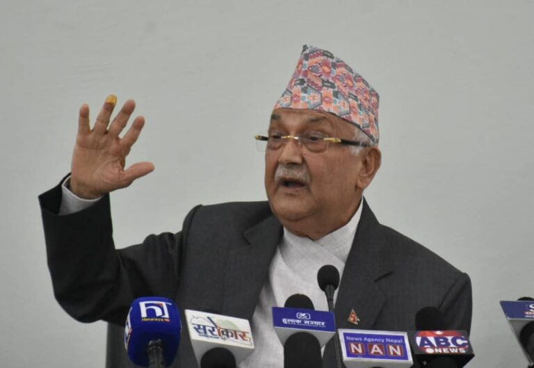 ‘गठबन्धन टुटाउन बल गर्नुप¥यो भनेर हल्ला चले पनि एक्लै चुनावमा जाँदा धुलोपिठो हुने डरले उनीहरू गठबन्धन टुटाउन चाहँदैनन्,’ ओलीले भने, ‘साँढेसँग लड्न सक्दिनँ भनेर उनीहरूले गठबन्धन गरेका हुन् । गठबन्धनमै रहेका केही दलहरूको हैसियत बाख्रासँग लड्न सक्ने खालको पनि छैन ।’