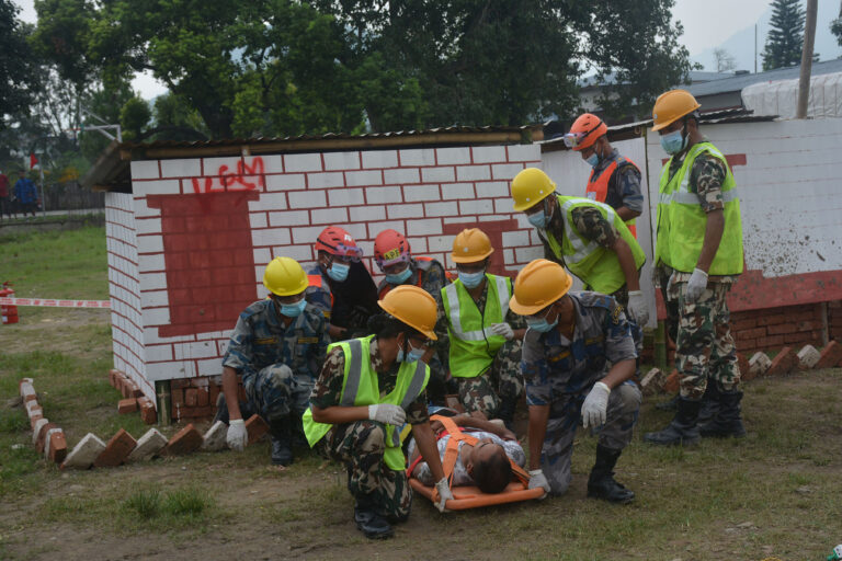 काठमाडौँ,१ असार । सशस्त्र प्रहरी मनकामना गण भानुले बुधबार दमौलीमा आयोजना गरेको विपद्सम्बन्धी पूर्व नमूना अभ्यासमा आगलागी भएको घर बारुणयन्त्रको सहयोगबाट निभाउने प्रयास गरिँदै । तस्बिर :कृष्ण न्यौपाने÷ रासस