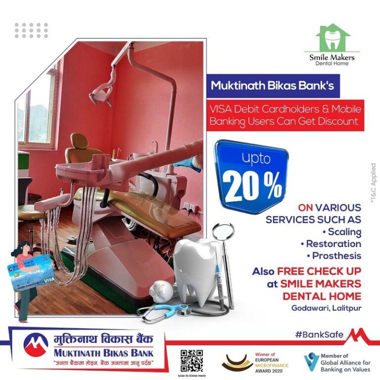 यस सम्झौता पश्चात बैंकका भिषा डेविट कार्डवाहक तथा मोबाइल बैंकिङ्ग ग्राहकहरुले ललितपुरमा रहेको इिस्माइल मेकरस् डेन्टल होममा विभिन्न सुविधाहरु जस्तै दाँत सफा गर्ने, दाँत भर्ने र नक्कली दाँत हाल्नेमा विशेष छुट प्राप्त गर्न सक्नेछन् ।