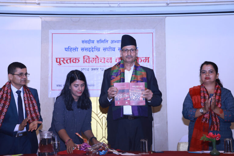 काठमाडौँ,१२ असार । सभामुख अग्निप्रसाद सापकोटा संसदीय मामिला पत्रकार समाजद्वारा प्रकाशित ‘संसदीय समिति अभ्यास–पहिलो संसददेखि सङ्घीय संसदसम्म’ नामक पुस्तकको आइतबार विमोचन गर्दै । तस्बिर : रत्न श्रेष्ठ÷रासस