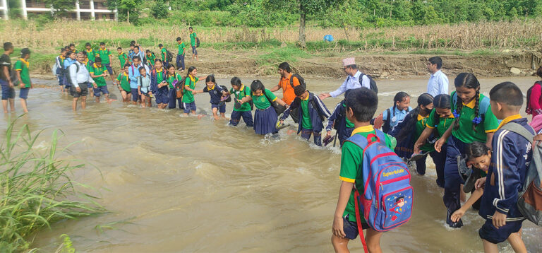 ‘दुई साता यता दिनहुँ जसो पानी परेको छ, खोला उर्लिएको बेला बोकेर विद्यार्थी तार्न सकिँदैन, सानो भएका बेला तारिरहेका छौँ।’ बालबालिकालाई खोला तार्न प्रहरी, स्थानीयबासी, अविभाबक, शिक्षकहरुले सघाउँदै आएका छन्। विद्यार्थीलाई आलोपालो गरी खोला तार्ने गरिएको छ।