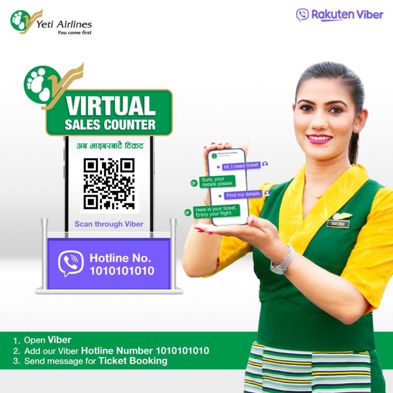 ‘भाइबर नेपालसँगको सहकार्यमा यात्रुहरुलाई सहज तरिकाले टिकट उपलब्ध गराउने उद्देश्यले ‘भर्चुअल सेल्स काउन्टर’ को व्यवस्था गरी यो सेवा २०७९ आषाढ १६ गतेबाट सुरु हुनेछ । हाम्रो भर्चुअल काउन्टर बिहान ७ः ०० बजेदेखि बेलुका ७ः ०० बजेसम्म १२ घण्टा खुल्ला रहने छ ।