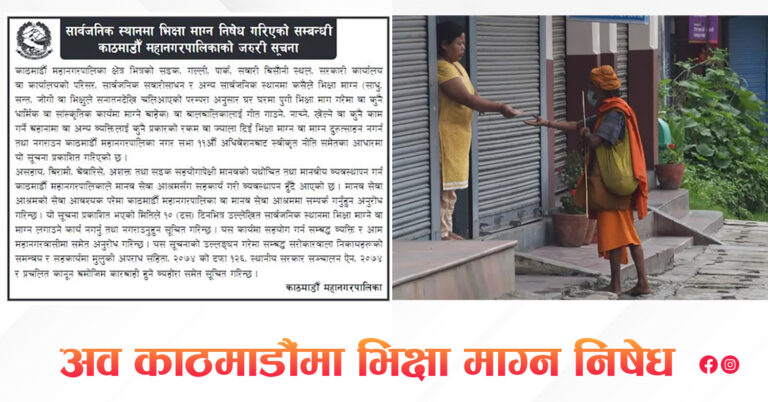 काठमाडौं, असार १७। काठमाडौं महानगरभित्रका क्षेत्रमा भिक्षा माग्न निषेध गरिएको छ । काठमाडौं महानगरपालिकाले एक सूचना निकालेर महानगर क्षेत्रभित्रका सडक, गल्ली, पार्क, बस बिसौनी, सरकारी कार्यालय परिसर, सार्वजनिक गाडी र अन्य सार्वजनिक ठाउँमा भीक माग्न निषेध गरेको हो ।