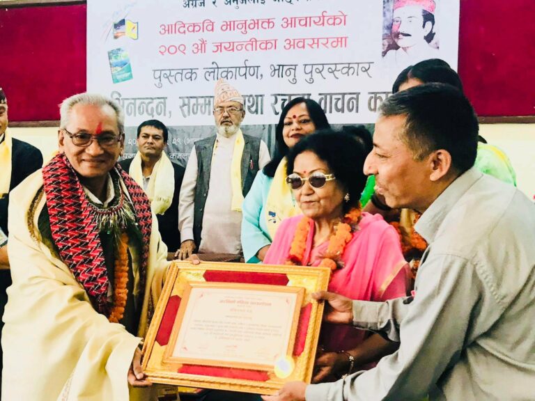 काठमाडौं, २९ असार । गोधूली साहित्य प्रतिष्ठानले साहित्यकार प्रेम छोटालाई ‘गोधूलि–भानु शिखर अभिनन्दन–२०७९’ प्रदान गरेको छ । बुधबार भानु जयन्तीको अवसरमा काठमाडौंमा आयोजित एक कार्यक्रमका प्रमुख अतिथि वरिष्ठ कवि तथा संस्कृतिविद् तुलसी दिवसले अभिनन्दन पत्र प्रदान गरेका हुन ।