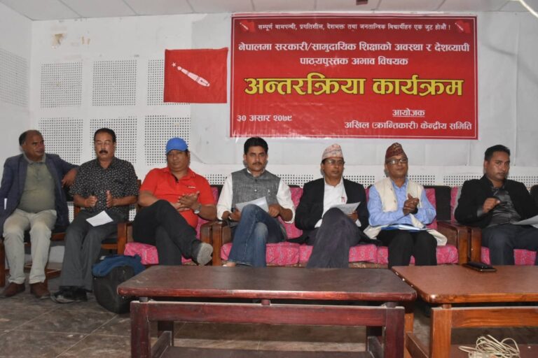काठमाडौं, ३० असार । नेत्रविक्रम चन्द ‘विप्लव’ निकट विद्यार्थी संगठन अखिल (क्रान्तिकारी) को केन्द्रीय समितिले नेपालमा सरकारी÷सामूदायिक शिक्षाको अवस्था र देशव्यापी पाठ्यपुस्तक अभाव विषयमा अन्तरक्रियाको आयोजना गरेको छ । पछिल्लो समय संगठनले विद्यार्थीका मुद्दा ज्वलन्त रुपमा उठाउँदै आएको छ।