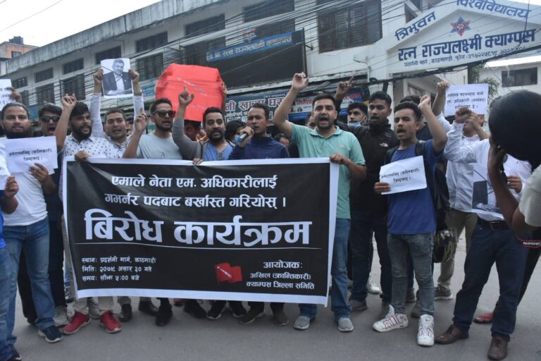 ‘गभर्नर भएर राजनीति गर्न पाइँदैन’, ‘अर्थतन्त्र तहसनहस पार्ने एम अधिकारी राजीनामा दे’ लगायतका नारासहितको प्लेकार्ड उनीहरुले प्रदर्शन गरेका थिए । त्यस क्रममा उनीहरुले सडक अवरुद्ध गर्दै टायर बालेर प्रदर्शनसमेत गरेका थिए ।