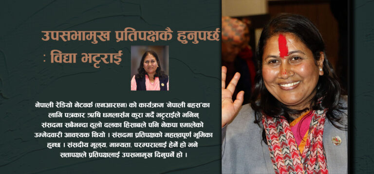 कति अवधिको सभामुख भन्दा पनि उपसभामुख खाली राख्नुहुन्न भन्ने मान्यताले आफू उम्मेदवार भएको पनि भट्टराईले औंल्याइन् । उनले थपिन्, “व्यवस्थापिकालाई कार्यपालिकाको हस्तक्षेपबिना स्वतन्त्र रुपले चलाउन उपसभामुख प्रतिपक्षको भए राम्रो हुन्छ । कति अवधिका लागि भन्ने कुरा महत्त्वपूर्ण होइन । त्यो पद खाली राख्नु हुँदैन भनेर नै अहिले प्रतिस्पर्धा गरिएको हो ।”