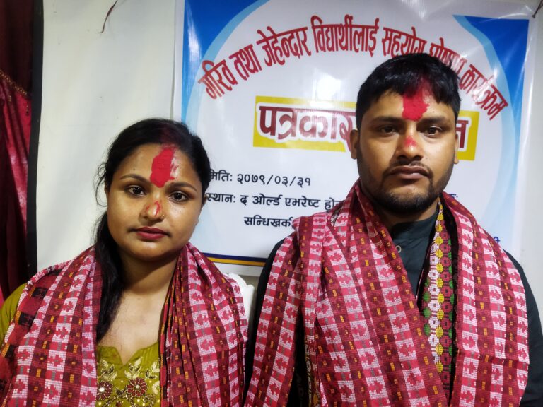 शुक्रबार अदालती विवाहबाट एक भएका नवदम्पती गणेश बेल्वासे र सुमित्रा भण्डारीले शीतगंगा नगरपालिका वडा नं ८,९,१० का विपन्न विद्यार्थीहरूलाई सहयोग गर्ने घोषणा गरेका छन् ।