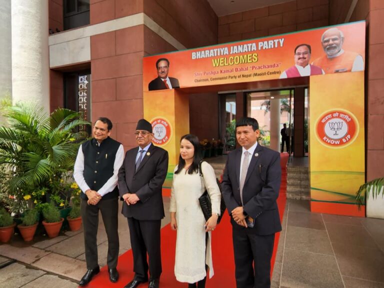 काठमाडौं, १ साउन । भारत भ्रमणमा रहेका नेकपा (माओवादी केन्द्र) का अध्यक्ष तथा पूर्व प्रधानमन्त्री पुष्पकमल दाहाल ‘प्रचण्ड’ भारतीय जनता पार्टीको मुख्यालय पुगेका छन् । सो क्रममा उनलाई विजेपीका अध्यक्ष जयप्रकाश नड्डाले दोसल्ला ओढाएर स्वागत गरेका थिए । दाहाल नड्डाकै निमन्त्रणामा भारत भ्रमणमा गएका हुन् । उक्त भेटवार्तामा भारतीय विदेशमन्त्री एस जयशंकर, भाजपाका नेताहरू र प्रचण्डपुत्री गंगा दाहालका साथै स्वकीय सचिव रमेश मल्ल सहभागी थिए ।