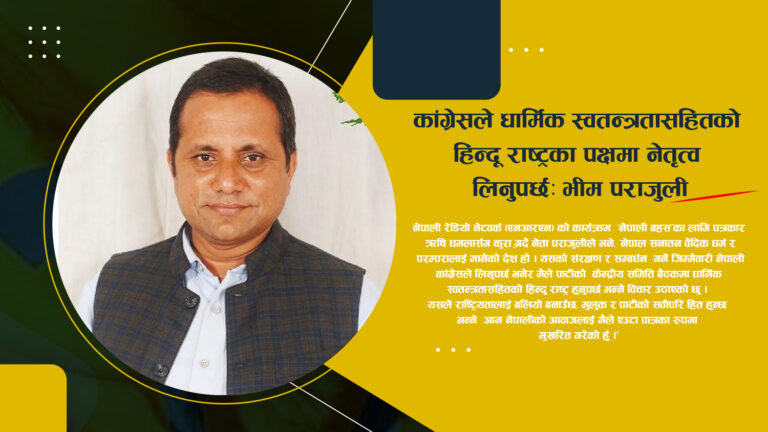 काठमाडौं, २ साउन । नेपाली कांग्रेसका केन्द्रीय सदस्य भीम पराजुलीले पार्टीले धार्मिक स्वतन्त्रतासहितको हिन्दू राष्ट्रका पक्षमा नेतृत्व लिनुपर्ने बताएका छन् ।