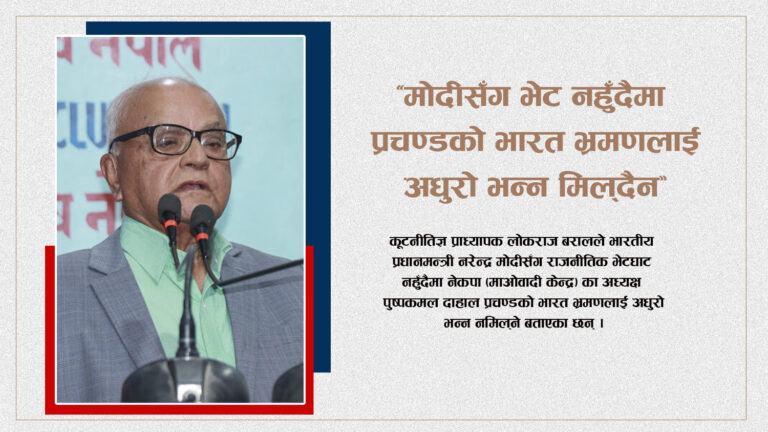 काठमाडौं, २ साउन । कूटनीतिज्ञ प्राध्यापक लोकराज बरालले भारतीय प्रधानमन्त्री नरेन्द्र मोदीसँग राजनीतिक भेटघाट नहुँदैमा नेकपा (माओवादी केन्द्र) का अध्यक्ष पुष्पकमल दाहाल प्रचण्डको भारत भ्रमणलाई अधुरो भन्न नमिल्ने बताएका छन् ।