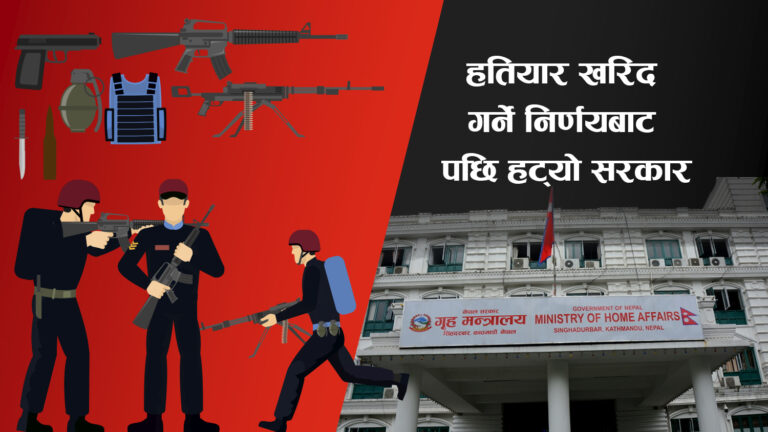 काठमाडौं, साउन २ । आर्थिक मन्दीको कारण देखाउँदै नेपाल प्रहरीका लागि हतियार खरिद गर्ने निर्णयबाट सरकार पछि हटेको छ। गृह मन्त्रालयले तत्काल हतियार खरिदको प्रक्रिया अघि नबढाउन नेपाल प्रहरीलाई निर्देशन दिने भएको छ। अर्थ मन्त्रालयले पनि हतियार खरिदका लागि दिन भनेको रकम रोकेको छ। ‘बजेट पनि रोकियो, अहिलेलाई हतियार खरिदको योजना पनि रोकियो,’ गृह मन्त्रालय स्रोतले भन्यो।