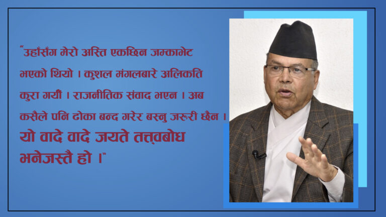 नेकपा एमालेका अध्यक्ष केपी ओलीसँग पनि राजनीतिक संवाद जरुरी भएको खनालले बताए । उनले थपे, “उहाँसँग मेरो अस्ति एकछिन जम्काभेट भएको थियो । कुशल मंगलबारे अलिकति कुरा गर्यौं । राजनीतिक संवाद भएन । अब कसैले पनि ढोका बन्द गरेर बस्नु जरुरी छैन । यो वादे वादे जयते तत्त्वबोध भनेजस्तै हो ।”