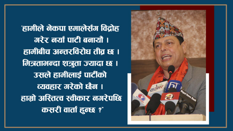नेपाली रेडियो नेटवर्क (एनआरएन) को कार्यक्रम ‘नेपाली बहस’का लागि पत्रकार ऋषि धमलासँग कुरा गर्दै नेता खतिवडाले भने, “हामीले नेकपा एमालेसँग विद्रोह गरेर नयाा पार्टी बनायौं । हामीबीच अन्तरविरोध तीव्र छ । मित्रताभन्दा शत्रुता ज्यादा छ । उसले हामीलाई पार्टीको व्यवहार गरेको छैन । हाम्रो अस्तित्व स्वीकार नगरेपछि कसरी वार्ता हुन्छ ?”