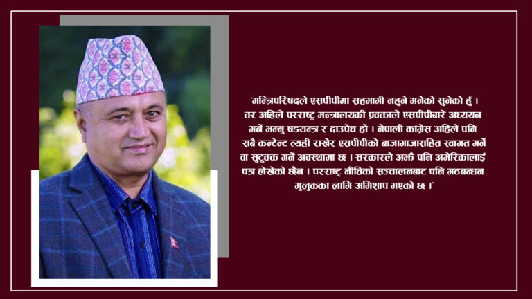 परराष्ट्र मन्त्रालयकी प्रवक्ताले एसपीपीबारे अध्ययन गर्ने भन्नु षडयन्त्र र दाउपेच भएको आरोप पनि उनले लगाए । उनले भने, “मन्त्रिपरिषदले एसपीपीमा सहभागी नहुने भनेको सुनेको हुँ । तर अहिले परराष्ट्र मन्त्रालयकी प्रवक्ताले एसपीपीबारे अध्ययन गर्ने भन्नु षडयन्त्र र दाउपेच हो । नेपाली कांग्रेस अहिले पनि सबै कन्टेन्ट त्यही राखेर एसपीपीको बाजागाजासहित स्वागत गर्ने वा सुटुक्क गर्ने अवस्थामा छ । सरकारले अझै पनि अमेरिकालाई पत्र लेखेको छैन । परराष्ट्र नीतिको सञ्चालनबाट पनि गठबन्धन मुलुकका लागि अभिशाप भएको छ ।”