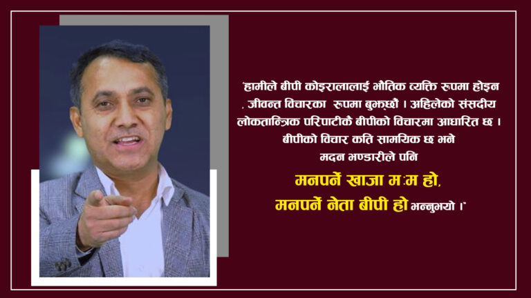 काठमाडौं, ६ साउन । नेपाली कांग्रेसका महामन्त्री विश्वप्रकाश शर्माले बीपी कोइराला भनेको व्यक्ति नभएर जीवन्त विचार भएको बताएका छन् ।
