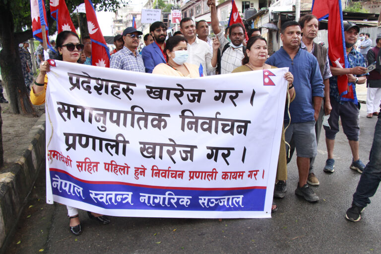 काठमाडौं, ६ साउन । प्रदेश र समानुपातिक निर्वाचन प्रणालीको खारेजीको आवाज बुलन्द बन्दै गएको छ । आज नेपाल स्वतन्त्र नागरिक सञ्जालले माइतीघरमा प्रदर्शन गर्दै चुनाव अघि नै प्रदेश र समानुपातिक प्रणाली खारेजीको माग गर्दै प्रदर्शन गरेको छ ।