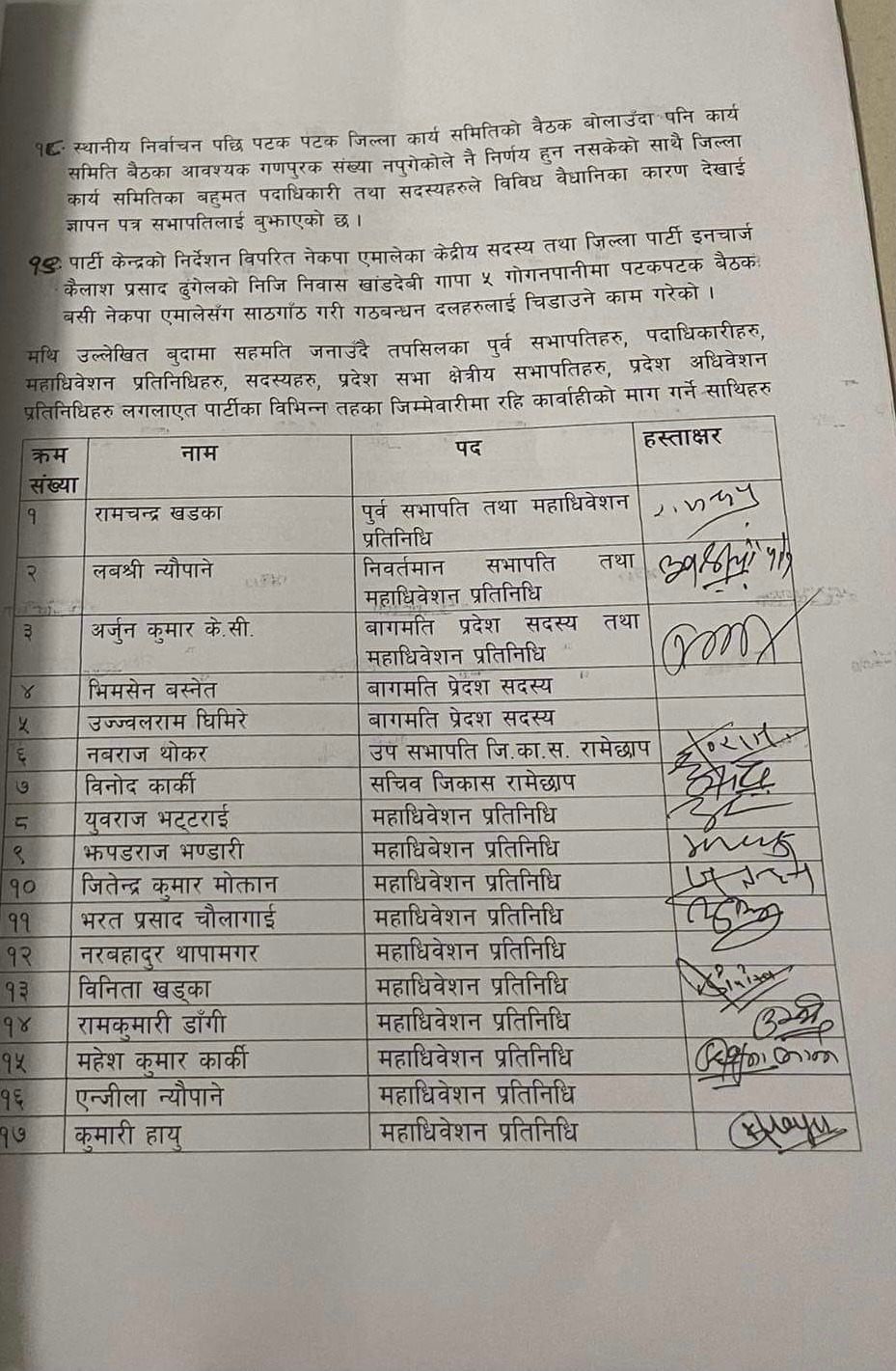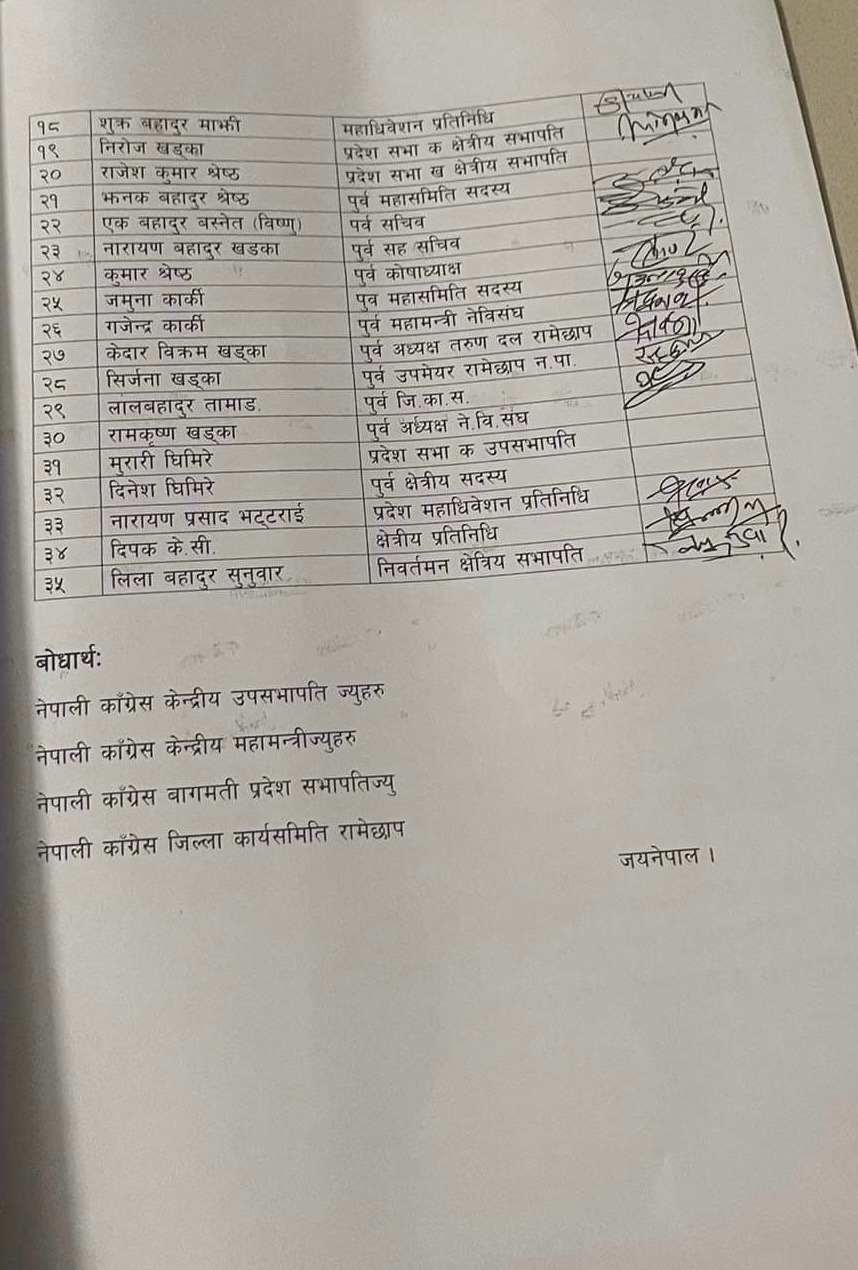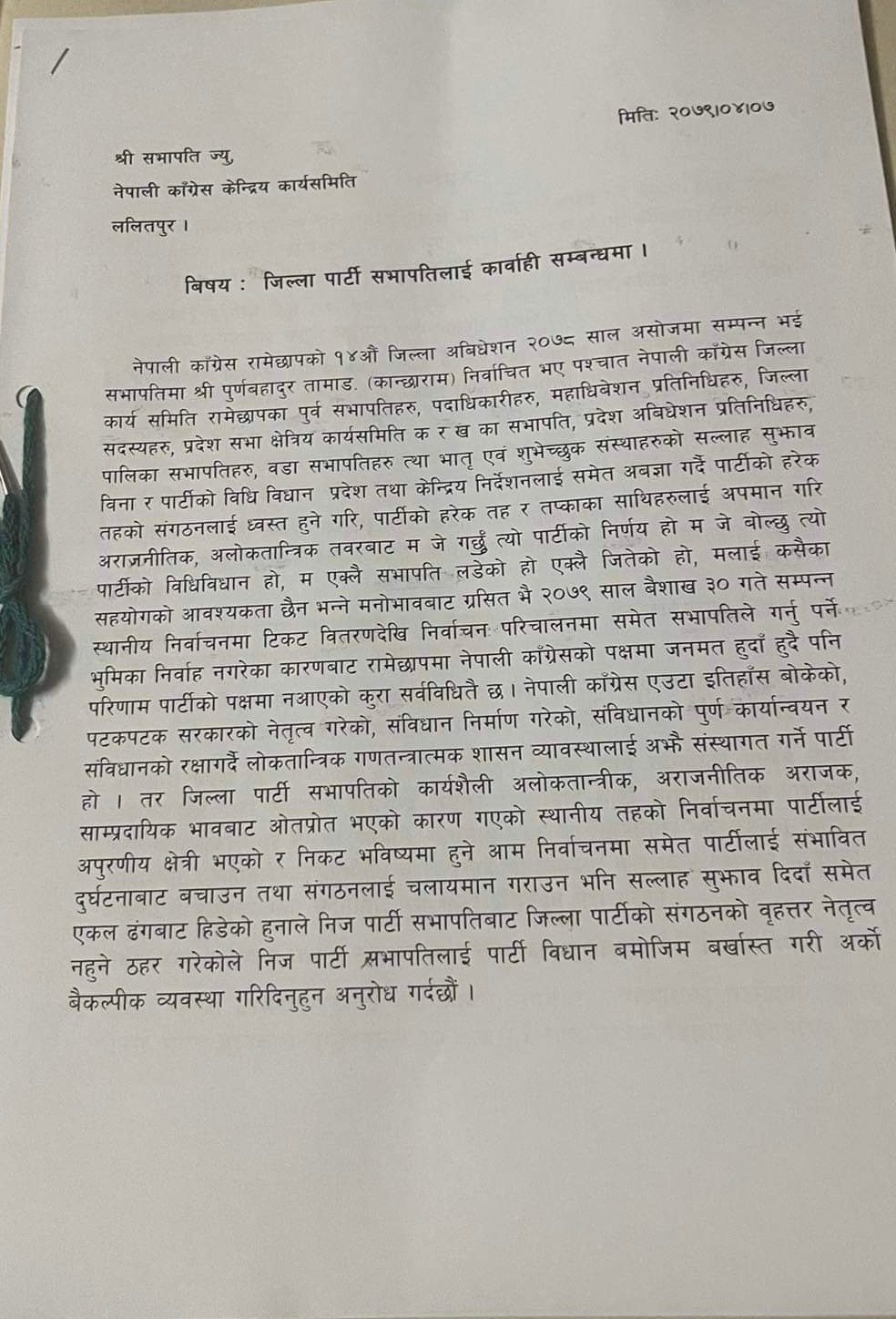 जिल्लाका प्रभावशाली नेताहरु पूर्व जिल्ला सभापति एव्म महाधिवेशन प्रतिनिधि रामचन्द्र खड्काको नेतृत्वमा विभिन्न २७ जना सदस्यहरुले सभापति तामाङलाई हटाउनको लागि हस्ताक्षरसहित केन्द्रीय सभापति देउवासमक्ष माग गरेका छन् ।
