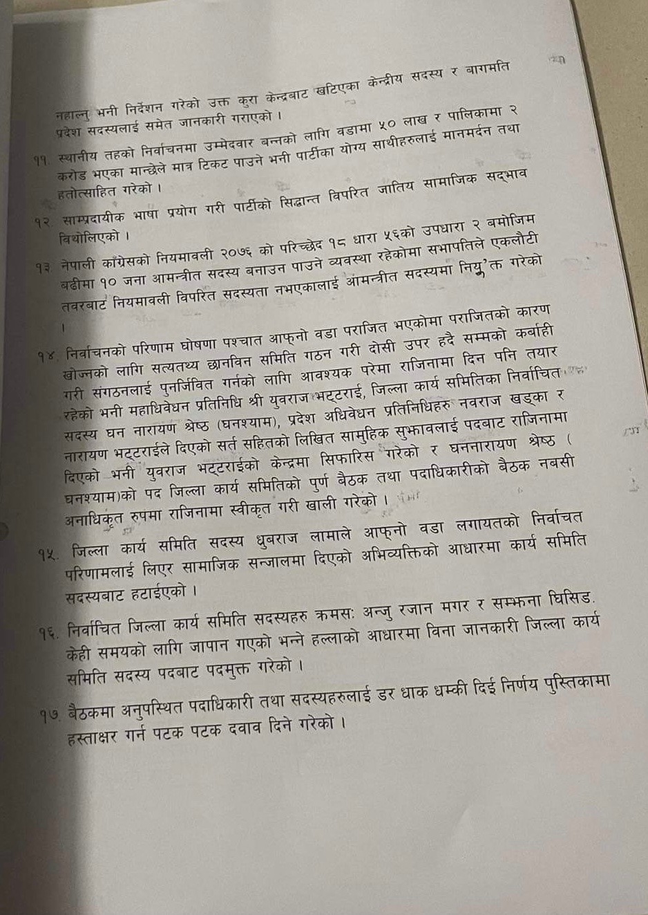 काठमाडौं, १२ साउन । नेपाली कांग्रेस जिल्ला कार्यसमिति रामेछापका सभापति कान्छाराम तामाङले पार्टीको विधानविपरित गतिविधि गरेको भन्दै कार्यसमितिका बहुमत सदस्यहरुले कारबाहीको माग गरेका छन् । ४८ जनामध्ये २७ जनाले सदस्यहरुले जिल्ला सभापति तामाङलाई बर्खास्त गर्न केन्द्रीय सभापति शेरबहादुर देउवासमक्ष माग गरेका छन् ।