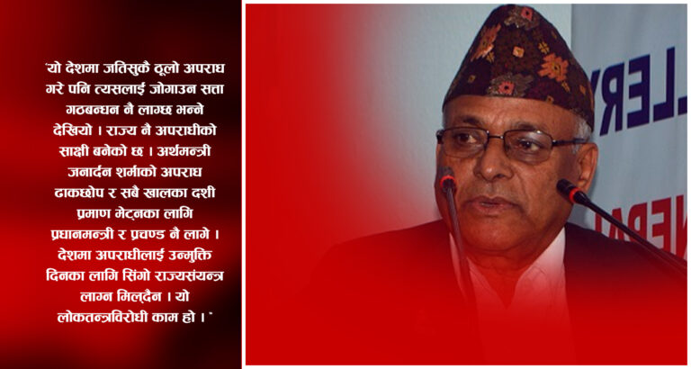 काठमाडौं, १६ साउन । नेकपा एमालेका नेता केशव बडालले अर्थमन्त्री जनार्दन शर्मालाई जोगाउन प्रधानमन्त्री शेरबहादुर देउवा र सत्तारुढ दल नेकपा (माओवादी केन्द्र) का अध्यक्ष पुष्पकमल दाहाल प्रचण्ड दुवै लागेको आरोप लगाएका छन् ।