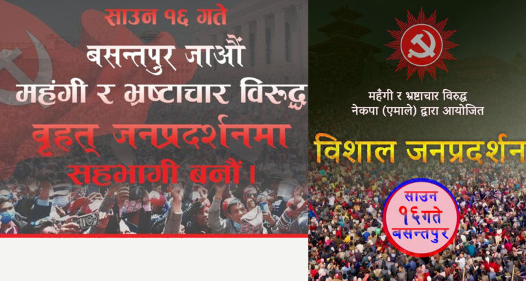 काठमाडौँ,१६ साउन । प्रमुख प्रतिपक्षी नेकपा (एमाले) ले जनसरोकारका विषयमा आज काठमाडौँमा आयोजना गरेको वृहत् जनप्रदर्शन कार्यक्रम सुरु भएको छ । मुलुकमा महँगी, भ्रष्टाचारलगायतका गतिविधि बढेको भन्दै सोको विरोधमा राजधानीका विभिन्न स्थानबाट ¥याली सुरु भएको हो । जनप्रदर्शन आयोजक कमिटीका कृष्णगोपाल श्रेष्ठका अनुसार जनप्रदर्शन दिउँसो वसन्तपुरमा मिसिएर भित्री सहर प्याफल, नरदेवी, बाङ्गेमुढा, असन, भोटाहिटी हुुँदै शान्तिबाटिकामा पुगेर समापनसभामा परिणत हुनेछ ।