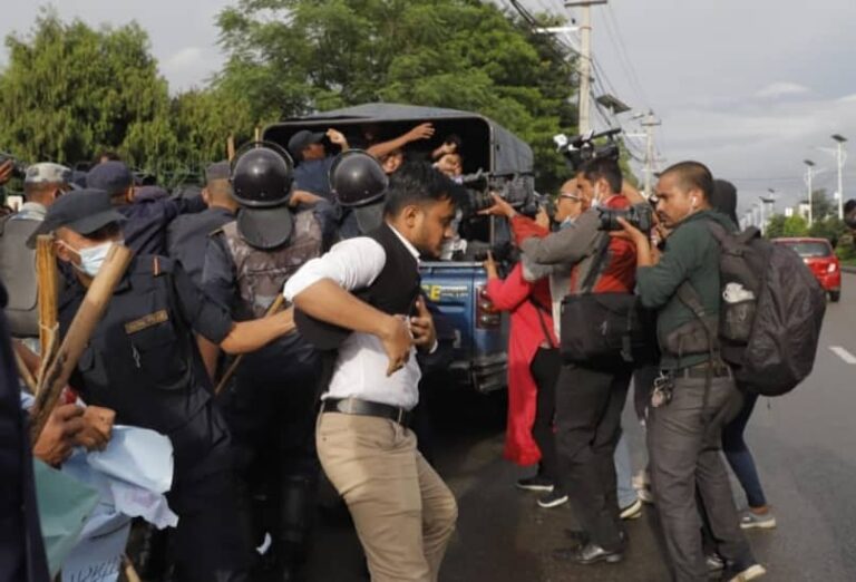 उनीहरुले शर्माबारेको छानबिनमा सरकार र प्रमुख प्रतिपक्षी दल नेकपा (एमाले) दुवै मिलेको आरोप लगाएका थिए । प्रदर्शनमा उत्रिएकाहरुलाई प्रहरीले पक्राउ गरेको थियो । तस्विर : मुकुन्द कालिकोटे, रिपोर्टर्स नेपाल डटकम