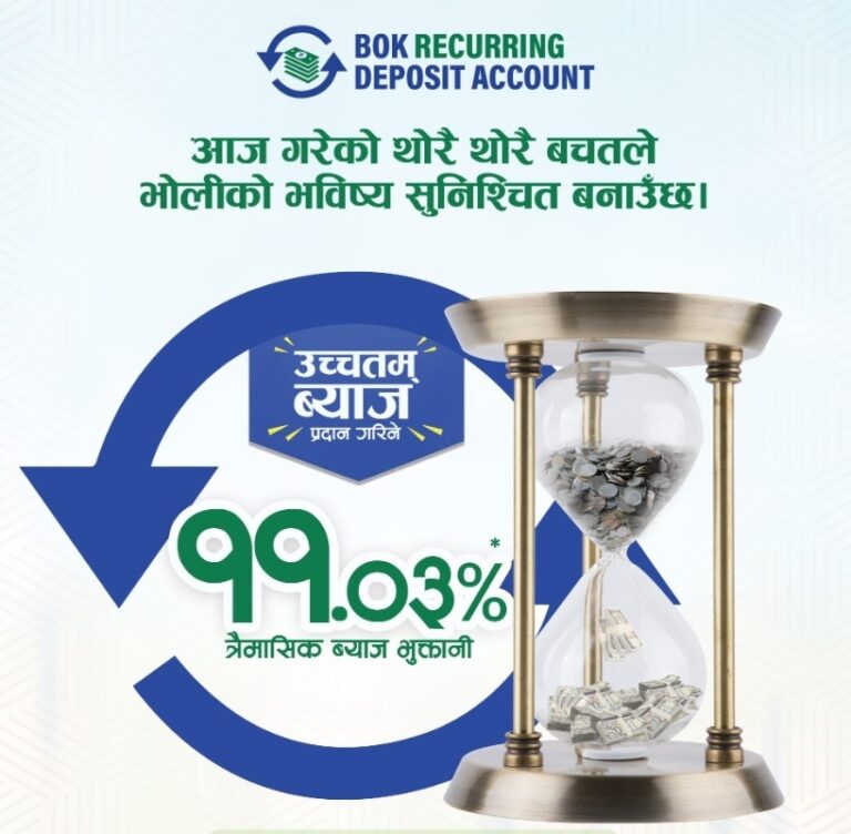 यस निक्षेप खातामा बैंकले खातावाहकहरुलाई त्रैमासिक रुपमा ब्याज भुक्तानी गर्नेछ । यस खातामा न्यूनतम् रु १,००० देखि बचत गर्न सकिनुका साथै आफ्नो भविष्यको वित्तीय आवश्यकतामा ध्यानमा राखी क्रमिक रुपमा अथवा दैनिक, साप्ताहिक तथा मासिक रु ५०० को गुणाङ्कमा न्यूनतम् १ वर्ष देखि अधिकतम् १० वर्ष बचत गर्न सकिने छ । यदि रिकरिङ्ग निक्षेप खातावाहक महानुभावलाई वित्तीय आवश्यकता भएमा सहुलियत ब्याजदरमा बचत रकमको ९०%सम्म कर्जा पाउने ब्यवस्था रहेको बैंकले जनाएको छ ।