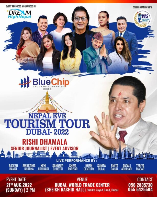 भोलि अगष्ट २१ तारिख दुवईको वल्र्ड ट्रेड सेन्टरको शिख रशिद हलमा आयोजना गरिने कार्यक्रममा पत्रकार धमला अतिथिको रुपमा सहभागी हुने भएका हुन् । उक्त ईभेन्टको व्यवस्थापन भने ड्रिम हाई नेपालले गरेको हो ।