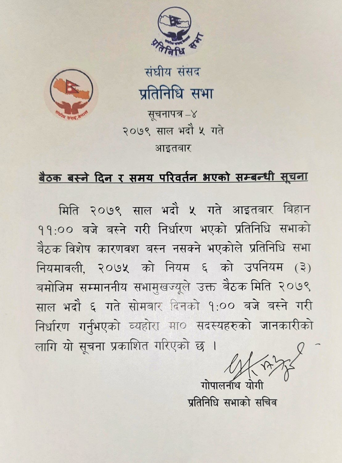 काठमाडौं, भदौ ५ । आज बिहान ११ बजेका लागि निर्धारण गरिएको प्रतिनिधिसभाको बैठक स्थगित भएको छ । आजको बैठक सोमबार एक बजेसम्मका लागि स्थगित गरिएको संसद सचिवालयले जनाएको छ ।
