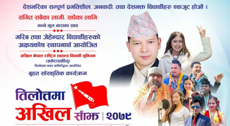 काठमाडौँ,५ भदौ । अखिल नेपाल राष्ट्रिय स्वतन्त्र विद्यार्थी युनियनद्वारा आयोजित अखिल साँझ कार्यक्रममा तिलोत्तमावासी रमाएका छन् । लामो समयपछि आयोजित सोे खुला साङ्गीतिक कार्यक्रम हेर्न तिलोत्तमा र बुटवलका सङ्गीतप्रेमी सहभागी भएका थिए । गरिब तथा जेहेन्दार विद्यार्थीको अक्षयकोष स्थापनार्थ सो कार्यक्रममा ख्यातिप्राप्त गायक–गायिकाले प्रस्तुति गरेका थिए ।