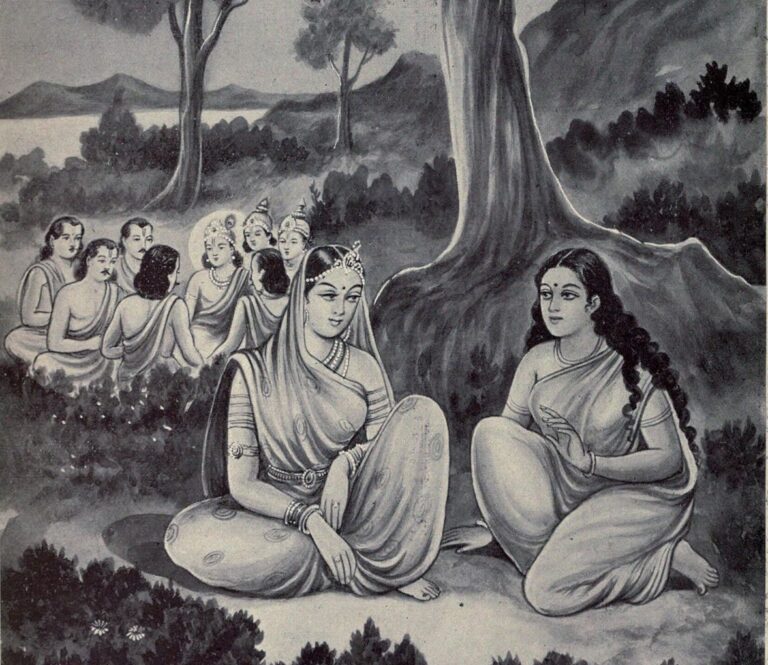 पाण्डवले जुवामा सर्वश्व हारेपछि १२ वर्षको वनवासमा थिए । श्रीकृष्ण र सत्याभामाले सँगै पाँच पाण्डव र द्रौपदीलाई भेटे । तब सत्याभामाले पाँच पाण्डव द्रौपदीले भनेको मानिरहेका छन् । उनलाई पूरा सम्मान दिइरहेका छन ।